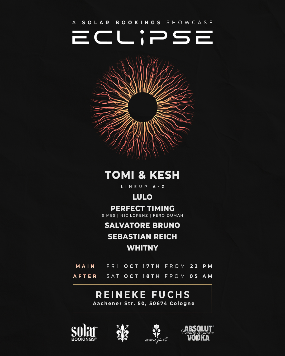 Solar is launching a brand-new night dedicated to cutting-edge underground sounds – and it all begins Friday, October 17th at 22:00 at the iconic Reineke Fuchs. Experience an unstoppable journey from night into morning and beyond – as we move seamlessly into the Afterhour starting Saturday, October 18th at 05:00.