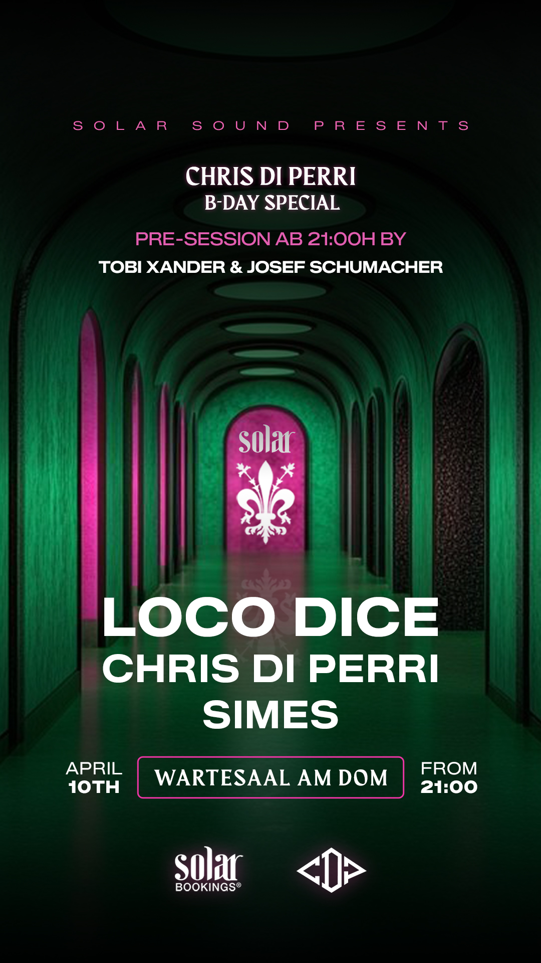 An seiner Seite stehen CHRIS DI PERRI und SIMES, beide auf dem Label Desolat vertreten, und sorgen für den musikalischen SOLAR Flow des Abends.